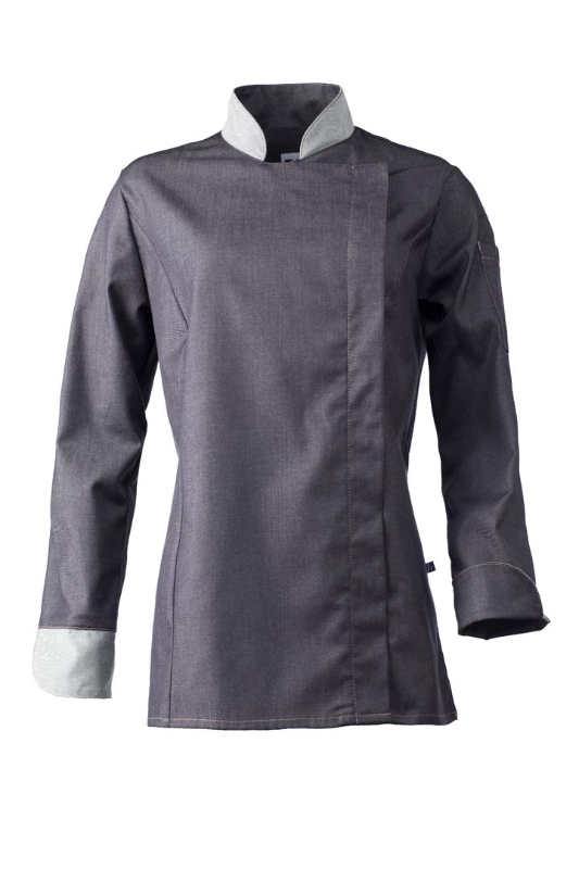 1/1 Arm mit Manschette, eine aufgesetzte Stifttasche auf dem linken Oberarm, verdeckte Knopfleiste mit Druckknöpfen. Ziernähte in Kontrastfarbe. Stehkragen außen und Manschetten innen in heller Farbe abgesetzt. Feintwill in Denimoptik.